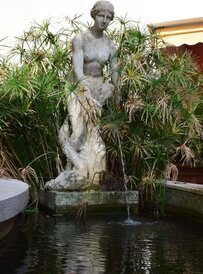 La maison domine un magnifique jardin aménagé. En contrebas de la terrasse, un bassin aux bords festonnés est alimenté par l'eau d'une source où se reflète une statue de femme, tenant entre ses mains un dauphin.