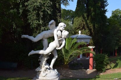 Placée à l'entrée de la propriété, une sculpture en marbre blanc représente Amour et Psyché, de l'artiste Morice.